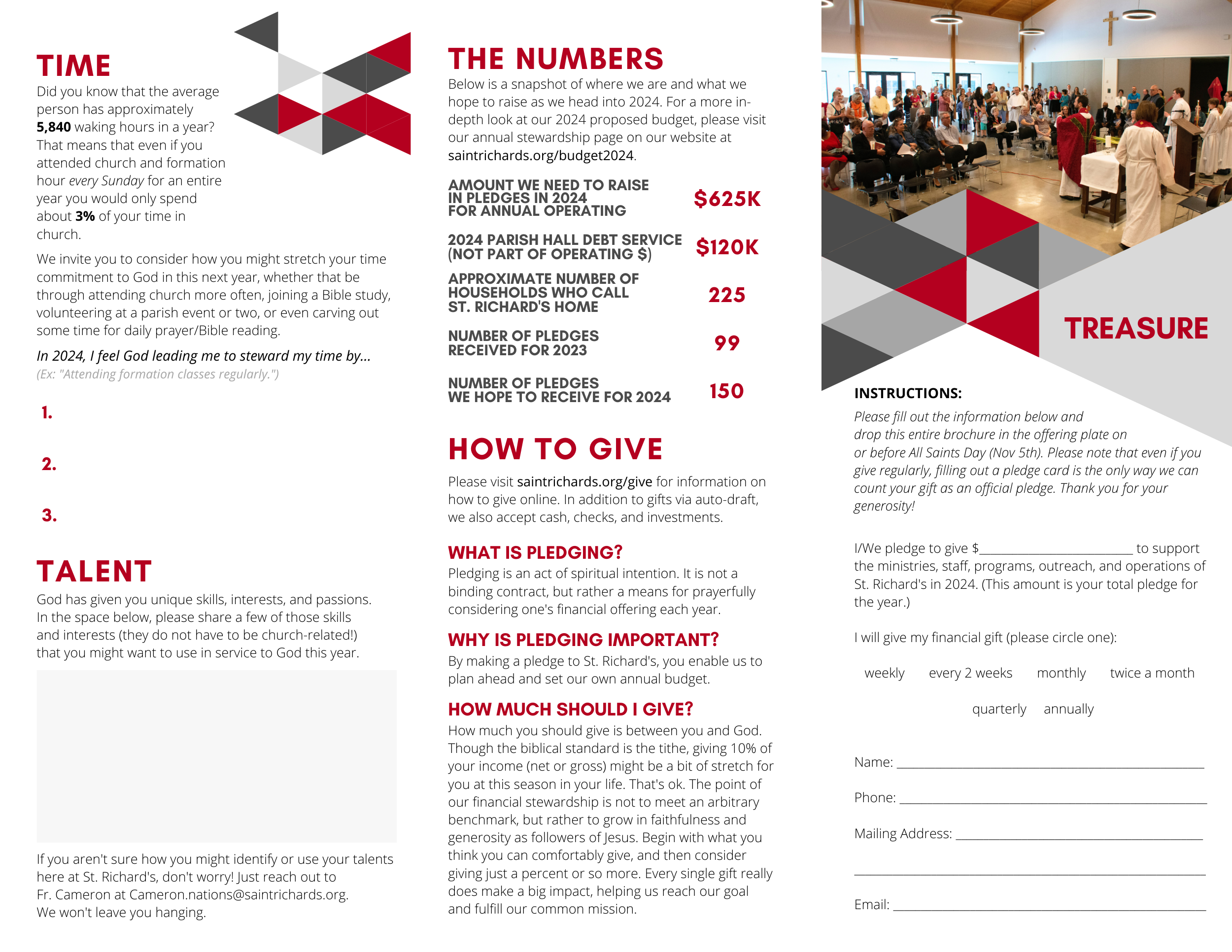 For this campaign, inspired by Paul’s ecclesiology in 1 Corinthians 12, we ditched the traditional pledge card in favor of a trifold brochure. Our vision for stewardship emphasized the notion that stewardship is much more than one’s financial commitment– it’s about one’s full participation in the life of Christ’s body, the Church.